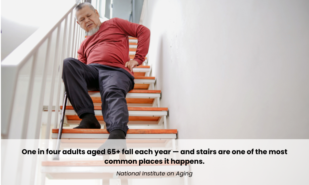 When assistive devices become part of your daily life, stairs present a major hazard. Climbing while holding a cane, dragging a walker up steps, or navigating stairs with limited mobility is not just difficult. It is dangerous.