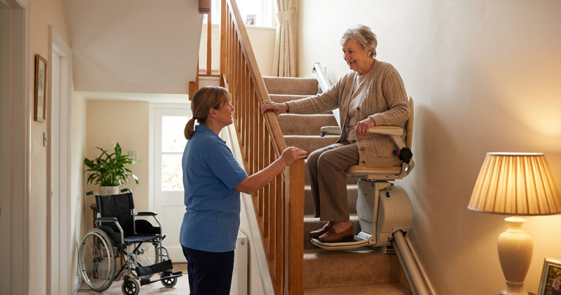 Stair Lifts: Stair lifts consist of a motorized elevator chair attached to rails that allows people who can use chairs to go up and down staircases. Stair lifts require users to transfer from their wheelchair into the elevator chair. Therefore, they are designed for individuals who have sufficient upper-body strength, balance, and safety skills to transfer from their wheelchair to the stair lift safely, whether independently or with assistance.