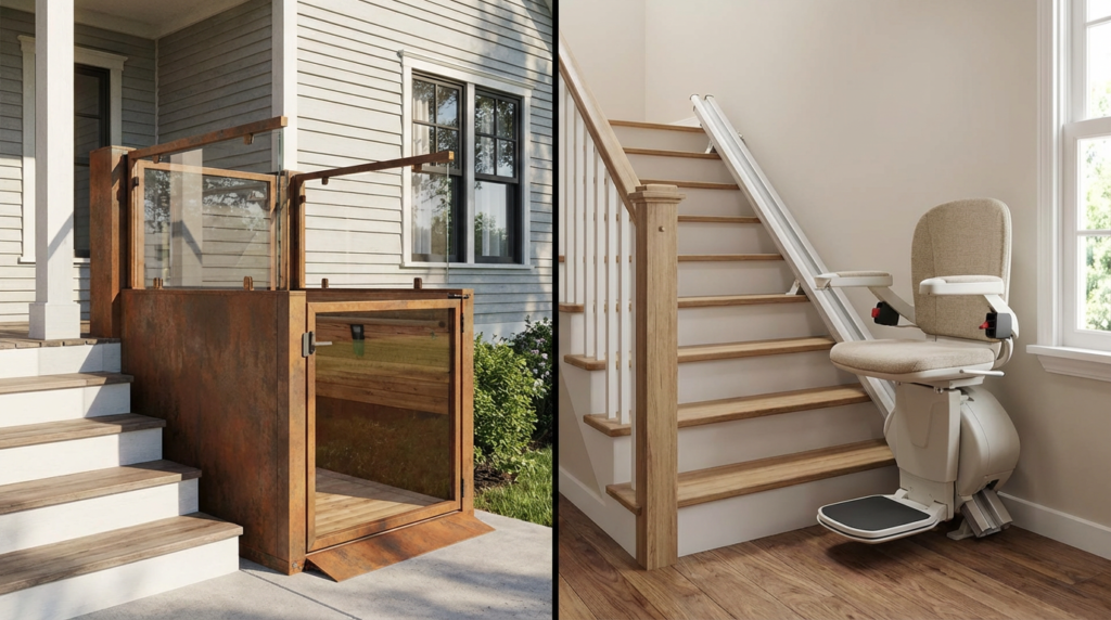 Wheelchair Stair Lifts/Platform Lifts: Vertical platform lifts (VPL) and inclined platform lifts (IPL) are designed for use by a user who remains seated in their wheelchair while using the lift. While a standard wheelchair stair lift requires transfer, a platform lift allows users to remain seated. These types of lifts are ideally suited to users who cannot safely transfer from their wheelchair or cannot operate a stair lift. Vertical and inclined platform lifts can be installed inside or outside your home, and their configuration can vary depending on the height and space limitations of your home.